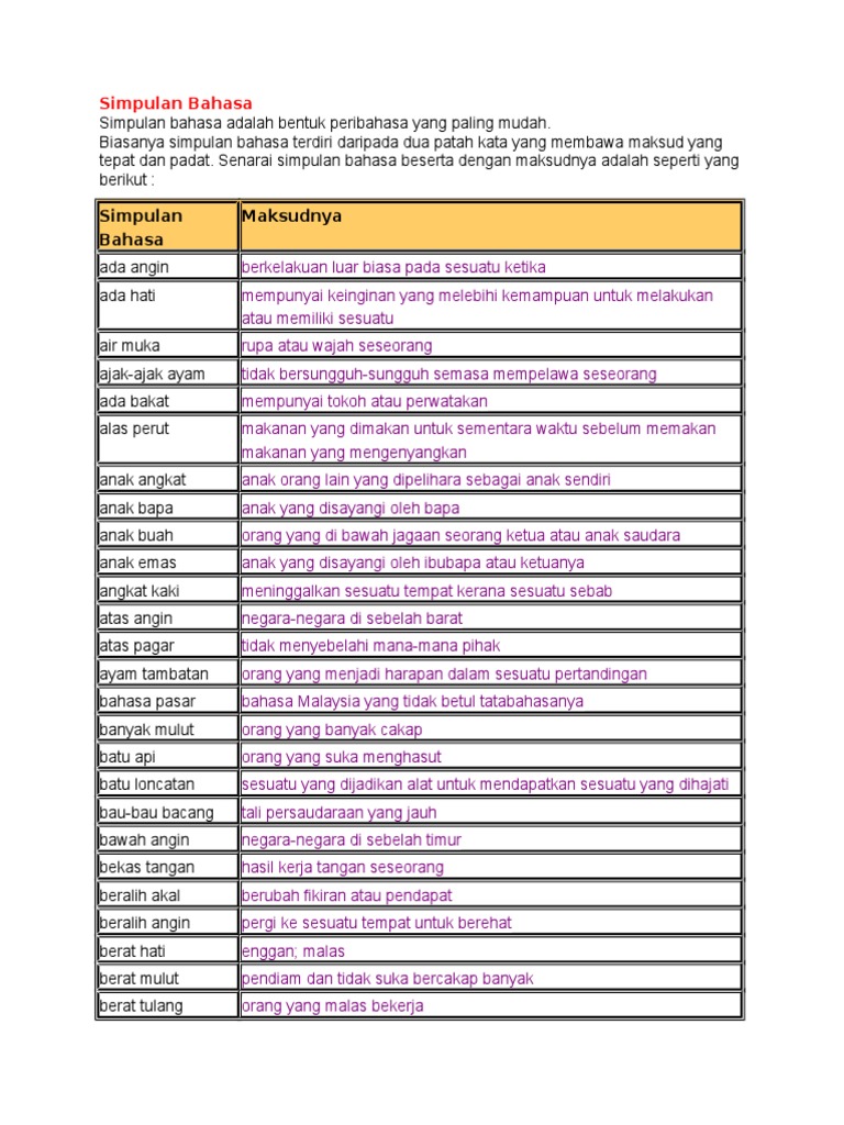 Simpulan bahasa adalah salah satu daripada jenis peribahasa. Simpulan ba asa, ma!su an #$n%$ a&a%. Simpulan bahasa adalah bentuk peribahasa yang paling mudah. Peribahasa adalah satu susunan kata atau ayat yang mempunyai maksud tertentu yang merujuk kepada maksud berkias, berlapik dan tersirat. Guru atau ibu bapa boleh gunakan wordwall untuk dedahkan anak dengan contoh dan maksud simpulan bahasa.